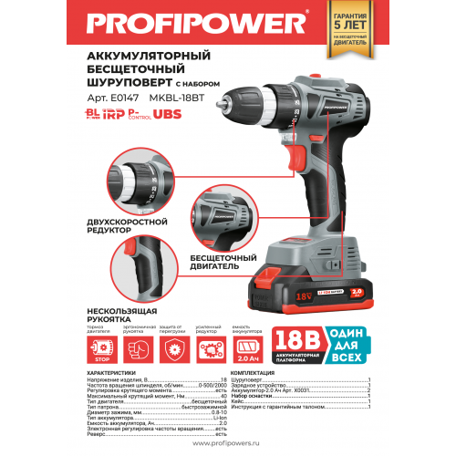 E0147 Аккумуляторный бесщеточный шуруповерт PROFIPOWER MKBL-18BT с набором оснастки
