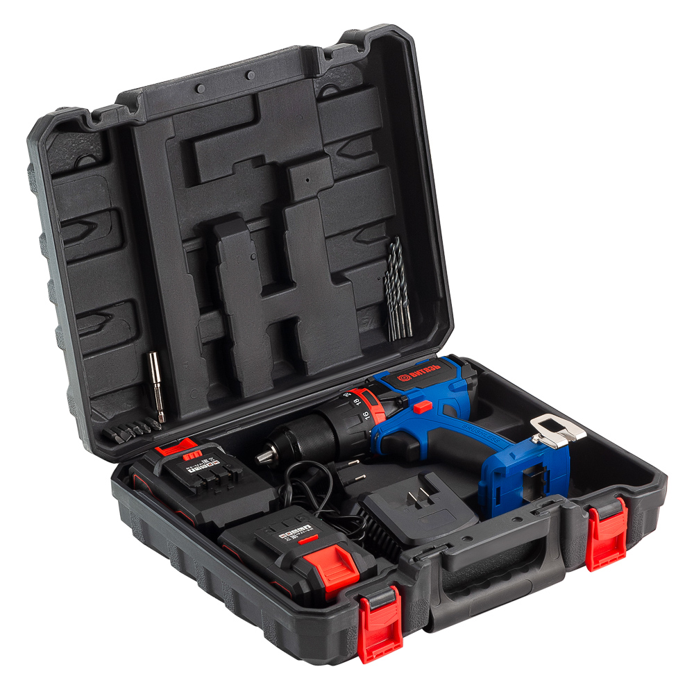 Аккумуляторный шуруповерт Витязь ДА -424-2 поставляется в пластиковом кейсе. В комплекте 2 шт аккумулятора, зарядное устройство, клипса, битодержатель, 6 бит, 6 сверл.