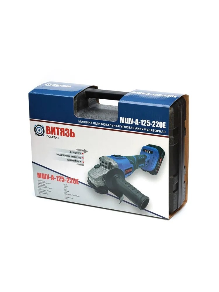 Витязь МШУ-А-125-220Е- бесщеточная аккумуляторная углошлифмашина с тонкой обрезиненной рукояткой отличается мощным двигателем, сочетающимся с небольшим весом и компактным размером, возможностью использования в местах без электроснабжения. Оснащена трехуровневой электронной регулировкой оборотов, пылезащитными фильтрами. Для удобства пользователя также предусмотрен быстрозажимной кожух. Число оборотов на каждой скорости: 1-я скорость – 5500 об/мин, 2-я скорость – 6300 об/мин, 3-я скорость – 7300 об/мин.