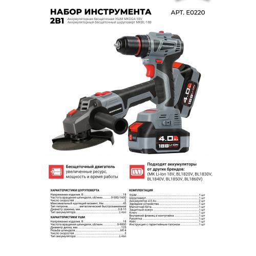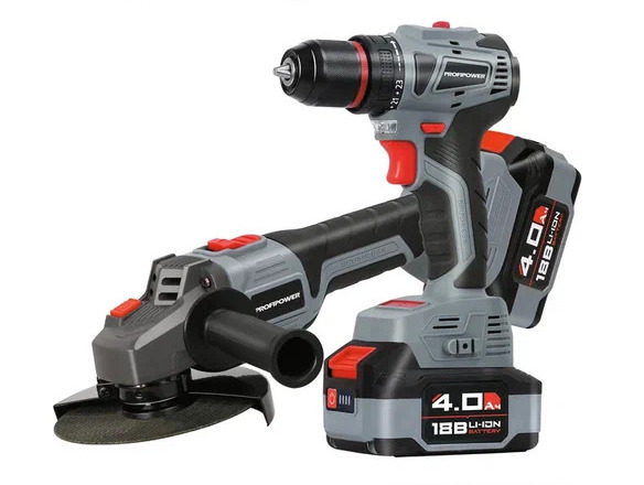 Набор инструментов ProfiPower 2 в 1 (болгарка, шуруповерт, 2 АКБ 4 А/ч, кейс) E0220 включает в себя 2 аккумуляторных инструмента: углошлифовальную машину ProfiPower MKDGA-18V и шуруповерт MKBL-18V, что помогает выполнять различные задачи во время ремонта.