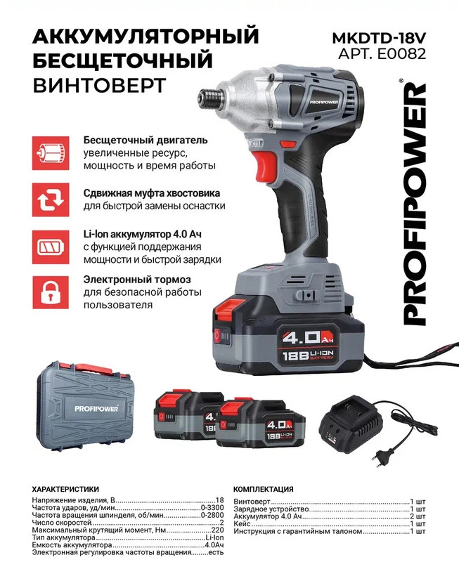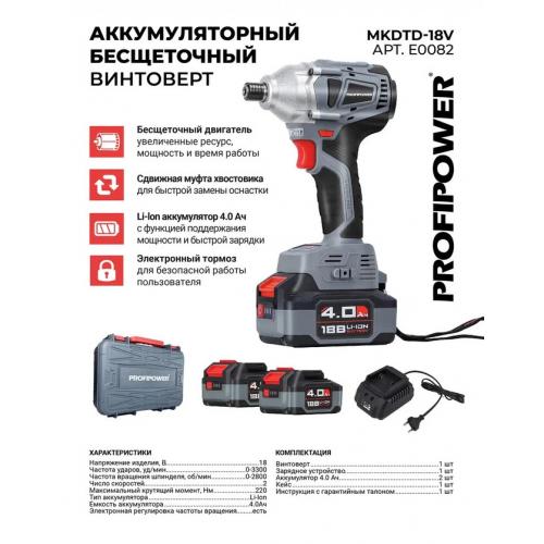 E0082 Аккумуляторный винтоверт беcщеточный импульсный PROFIPOWER MKDTD-18V
