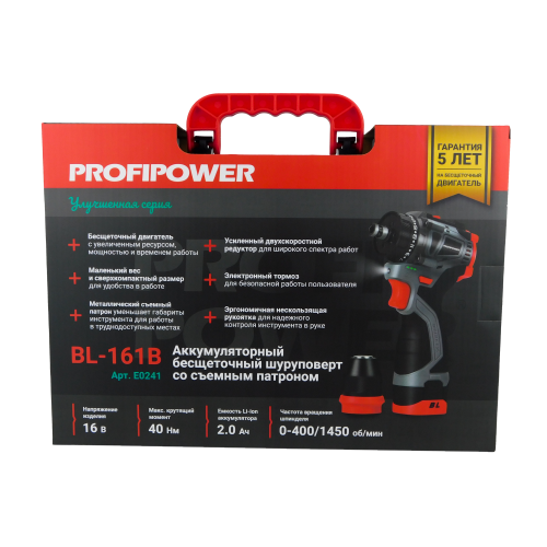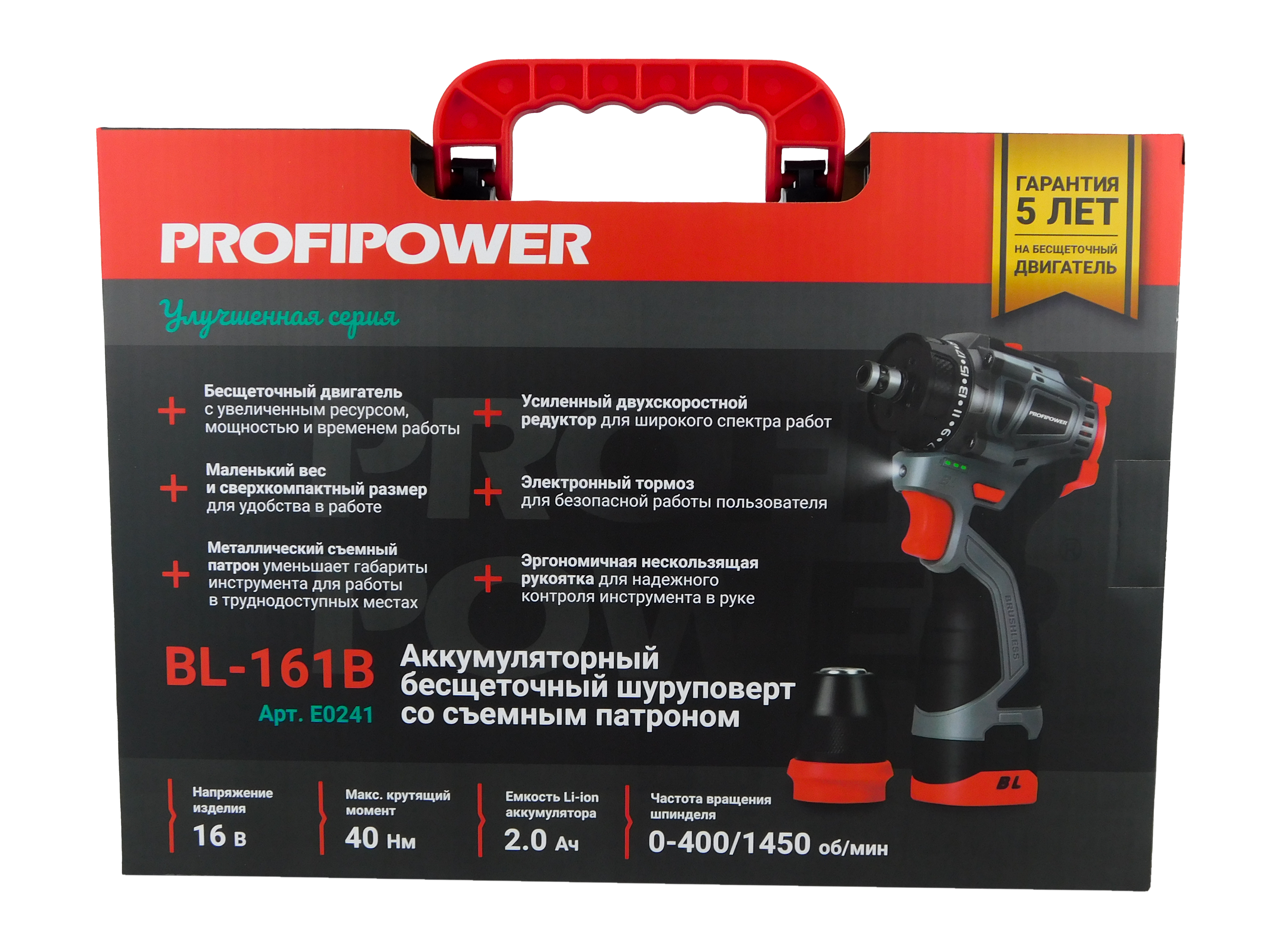 Аккумуляторный бесщеточный шуруповерт со съемным патроном Profi-Compact PROFIPOWER BL-161B предназначен для сверления древесины, металлов, керамики и синтетических материалов, для завинчивания или откручивания винтов, нарезания резьбы.