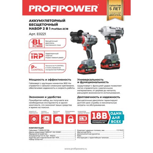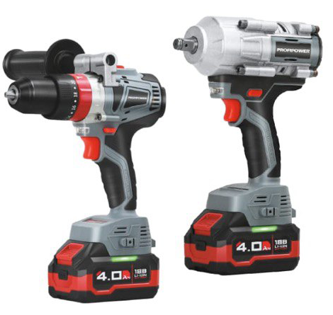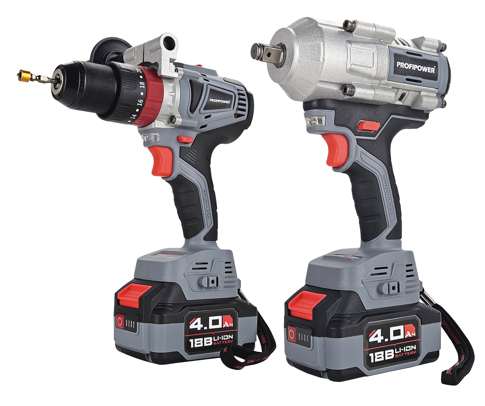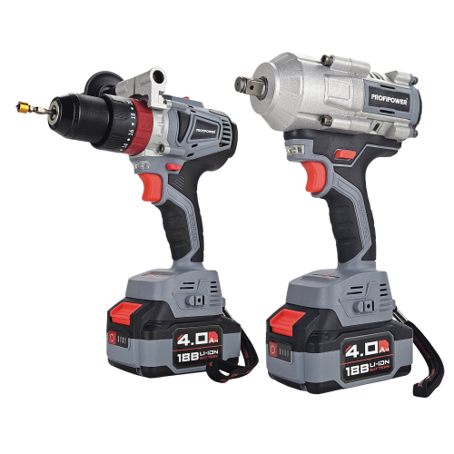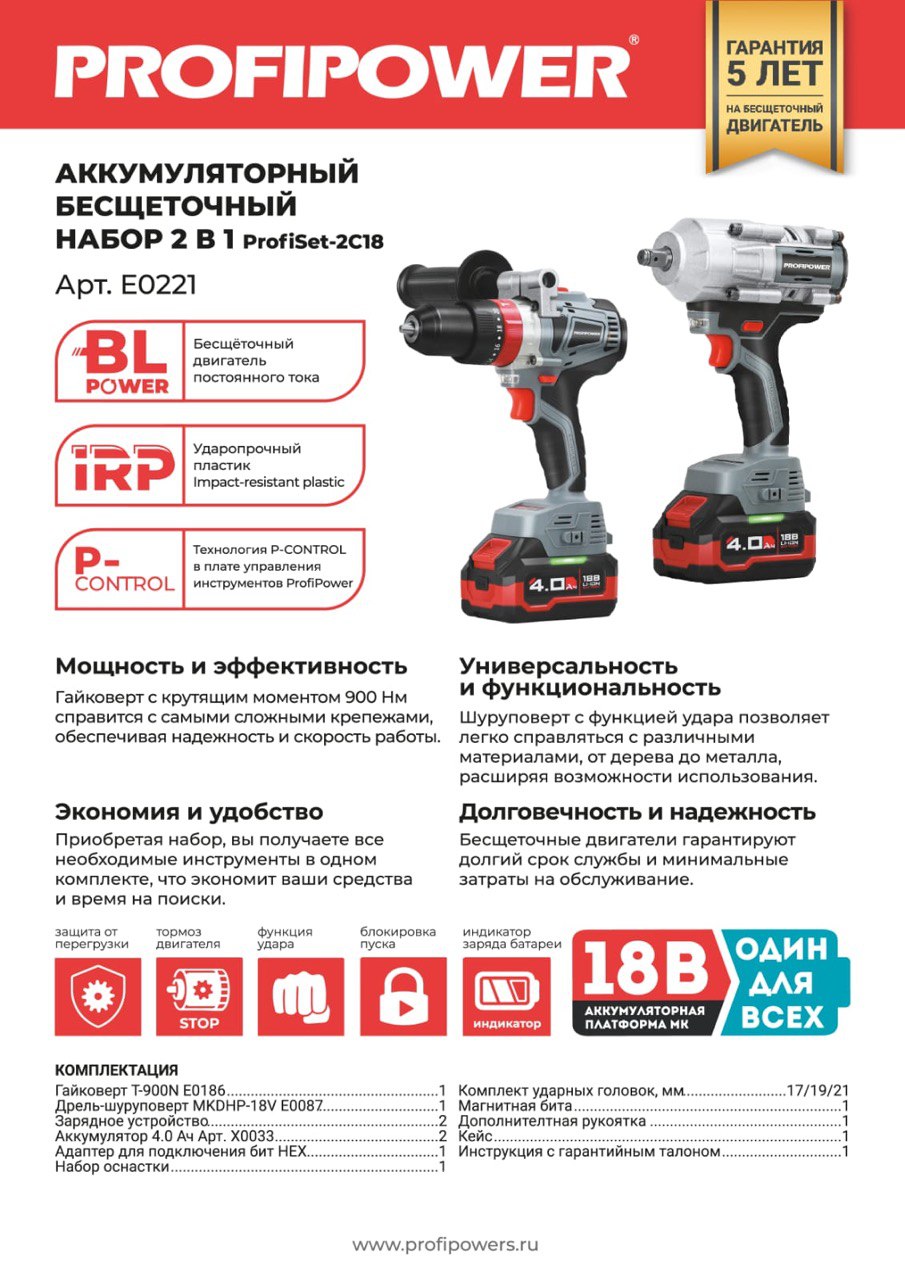 Набор бесщеточных инструментов 2в1 ProfiSet-2С18 включает в себя 2 аккумуляторных инструмента: Рыбацкий шуруповерт ProfiPower MKDHP-18V и Гайковерт на 900Нм ProfiPower T-900N, что помогает выполнять различные задачи во время ремонта.