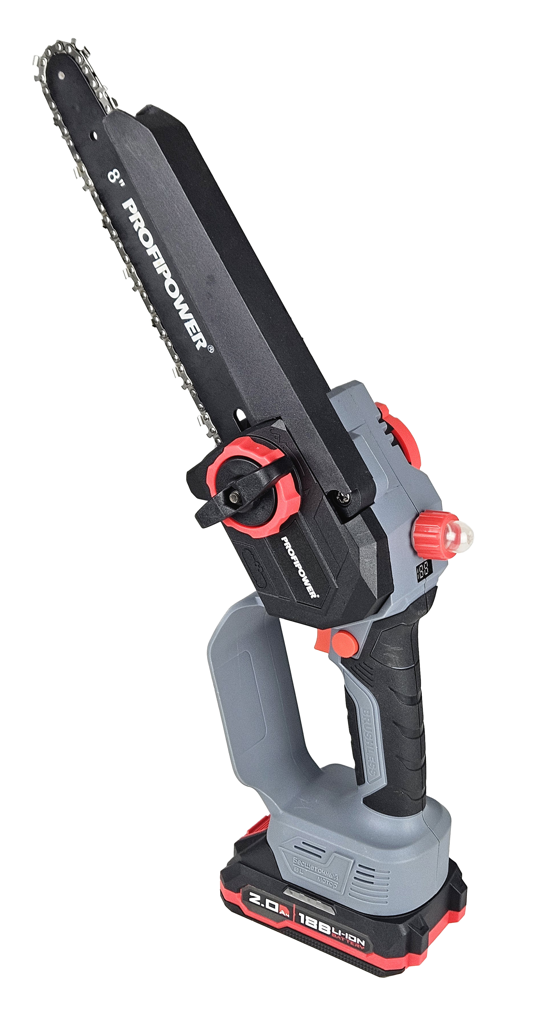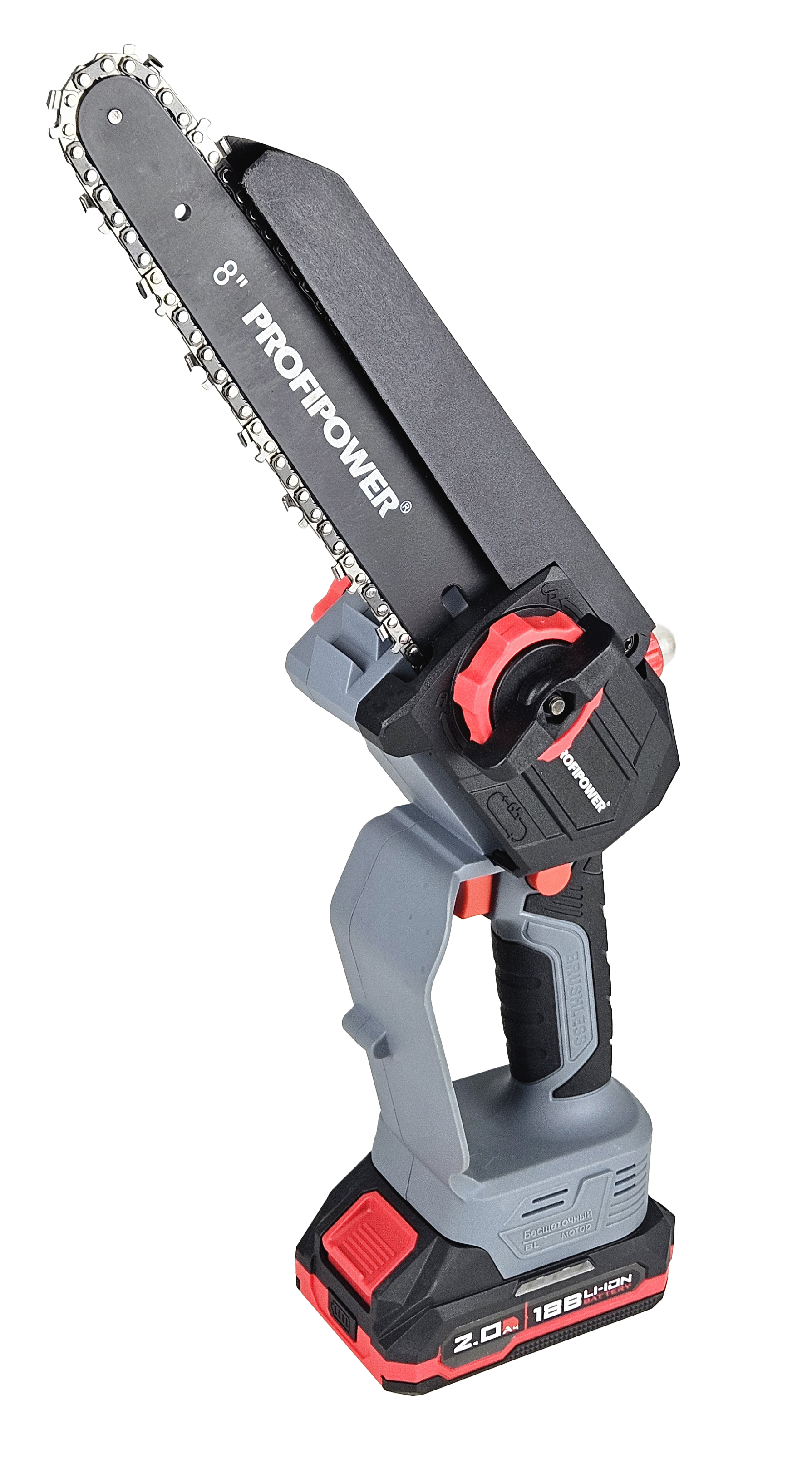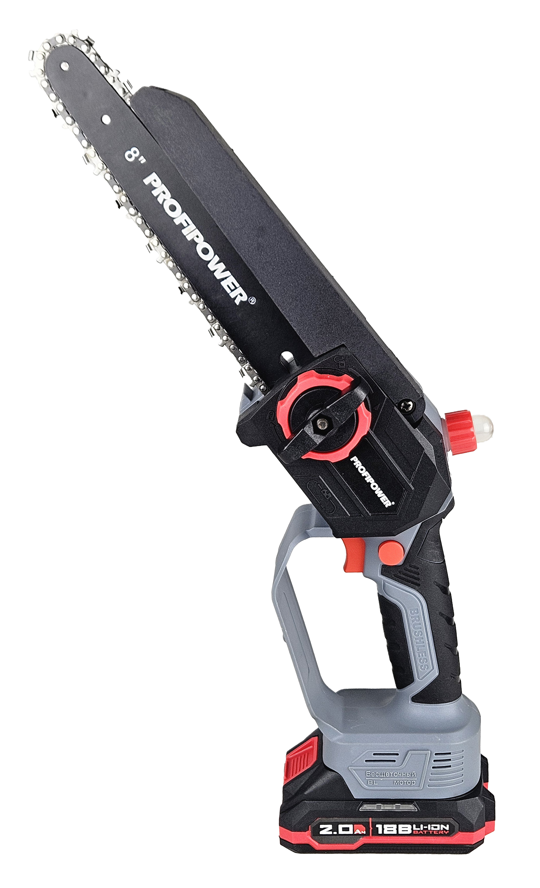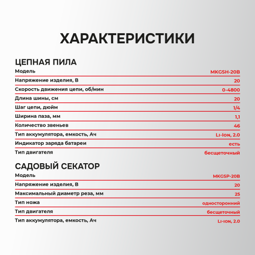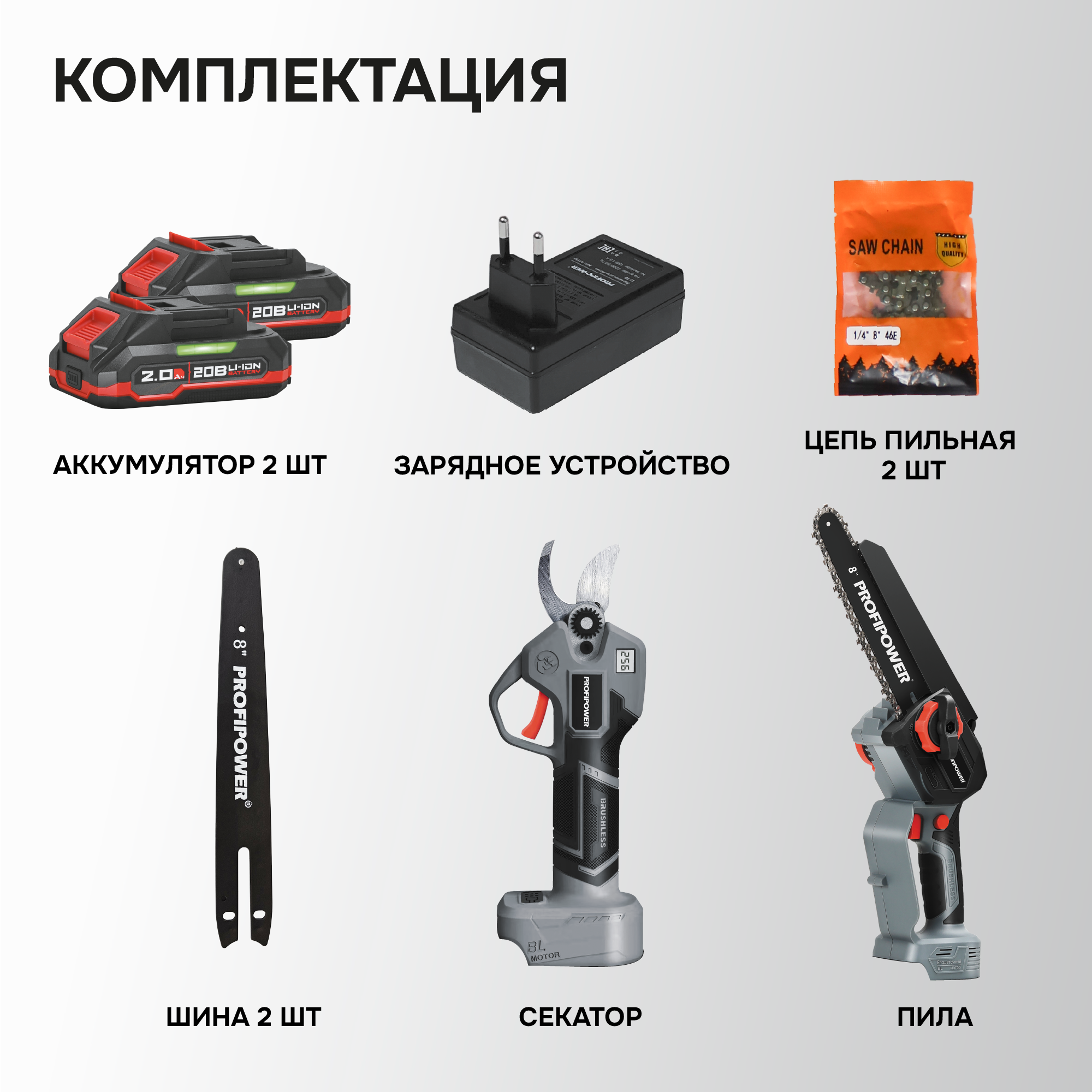 В комплекте: коробка, мини-пила с масляной подачей, секатор, 2 цепи и шины по 8 дюймов
