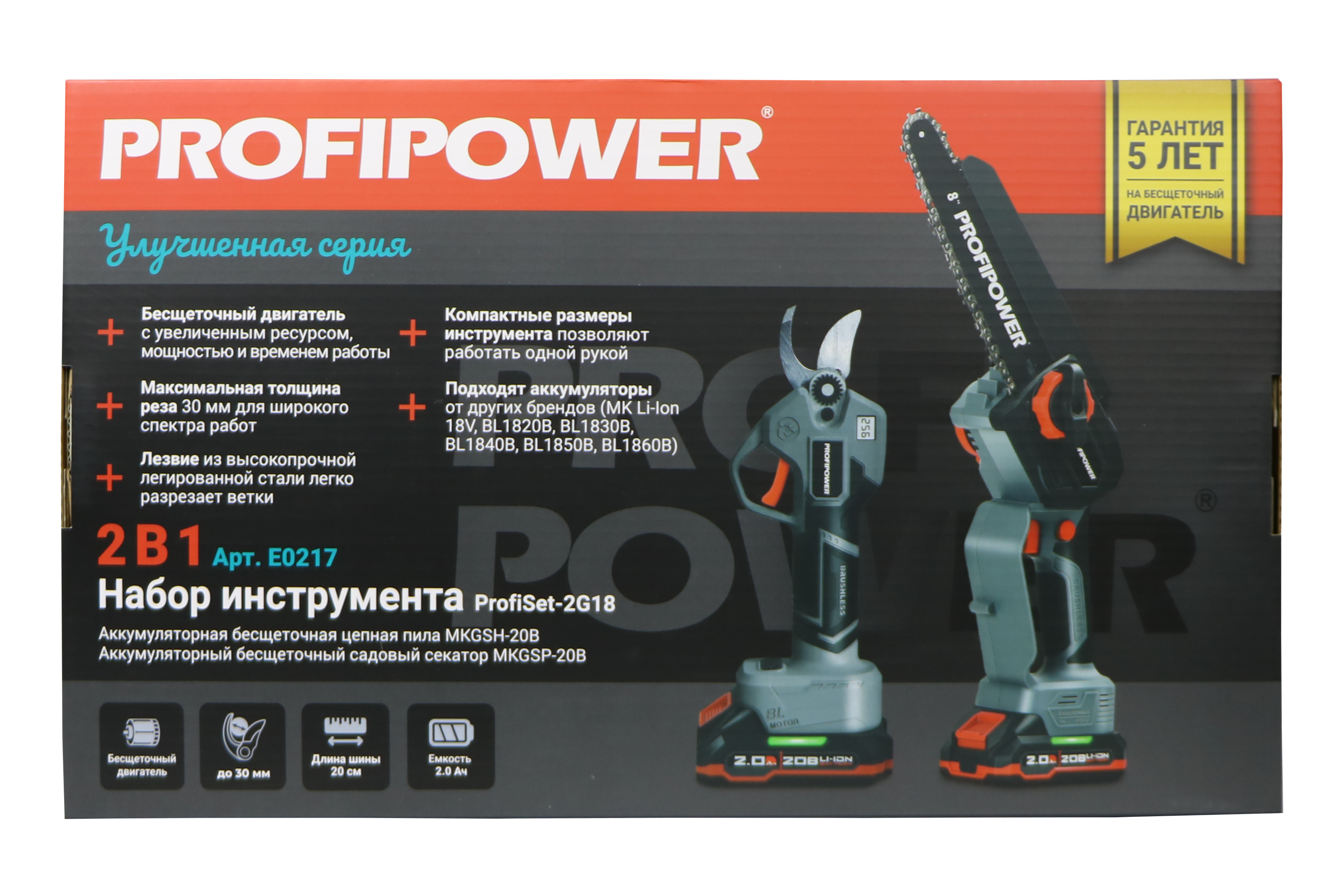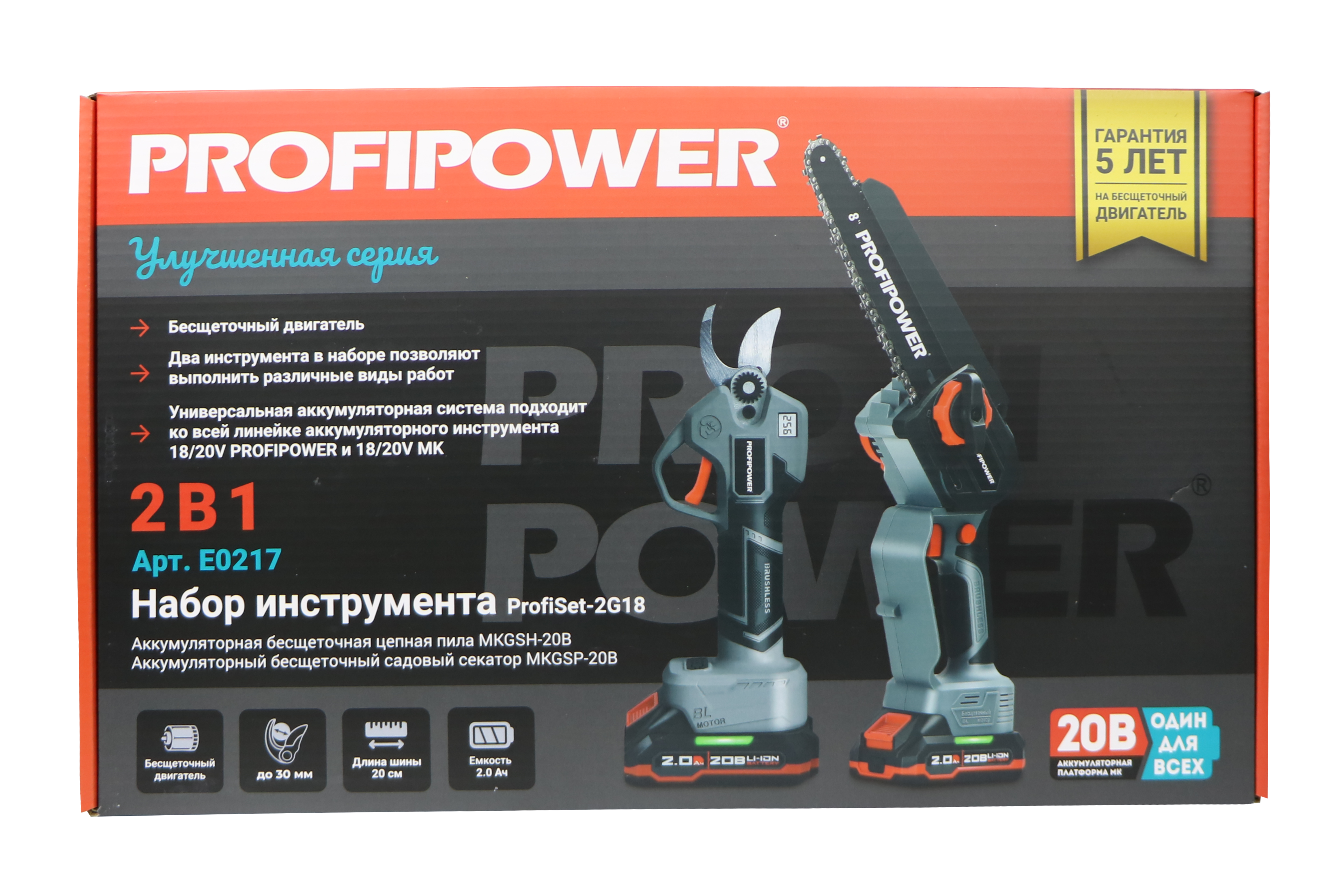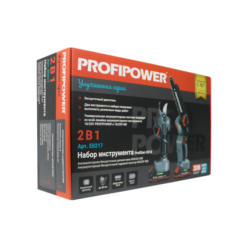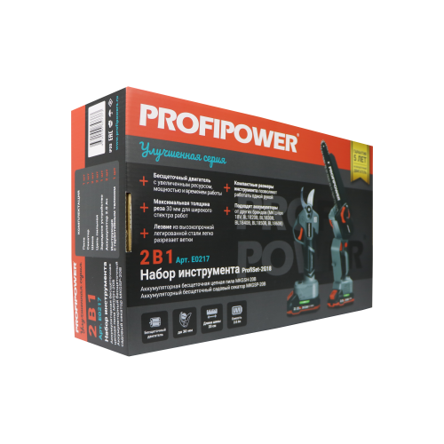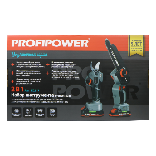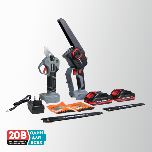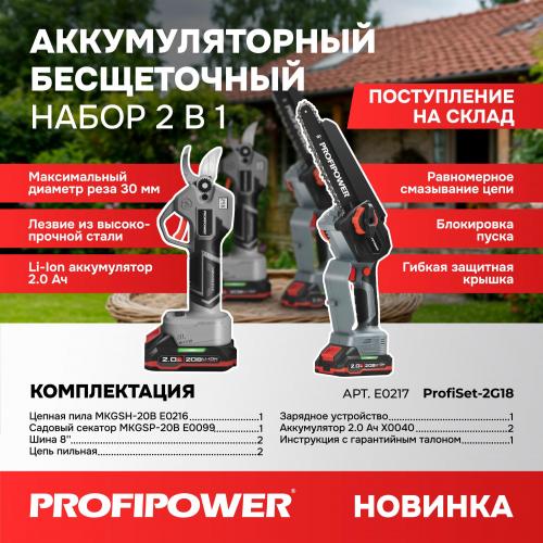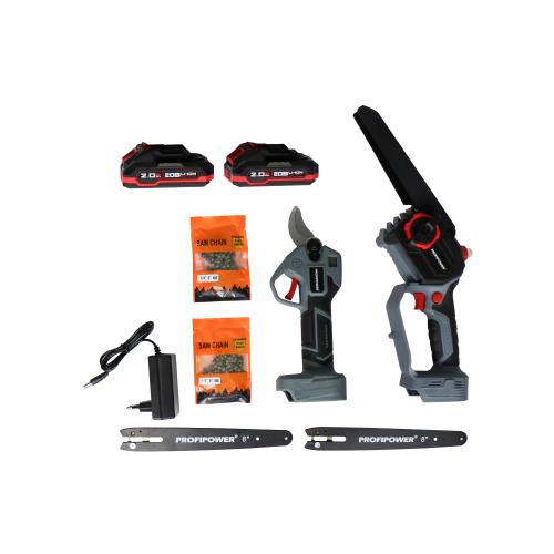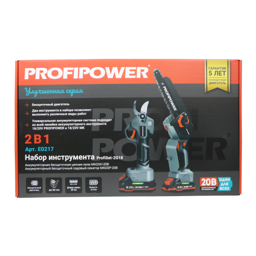E0217 набор аккумуляторных инструментов PROFIPOWER ProfiSet-2G20 — универсальный 2в1 комплект для садовых и бытовых задач. Включает два литий-ионных аккумулятора 20В, 2.0Ач с зарядным устройством и коробку для удобного хранения и транспортировки. В комплект входят мощная мини-пила с масляной подачей, секатор и два комплекта цепей и шин по 8 дюймов — идеально подходят для обрезки деревьев, кустарников и других работ на участке. Бесщеточный двигатель обеспечивает долговечность и высокую производительность. Надежный, компактный и легкий в использовании набор — ваш незаменимый помощник в саду и дома!