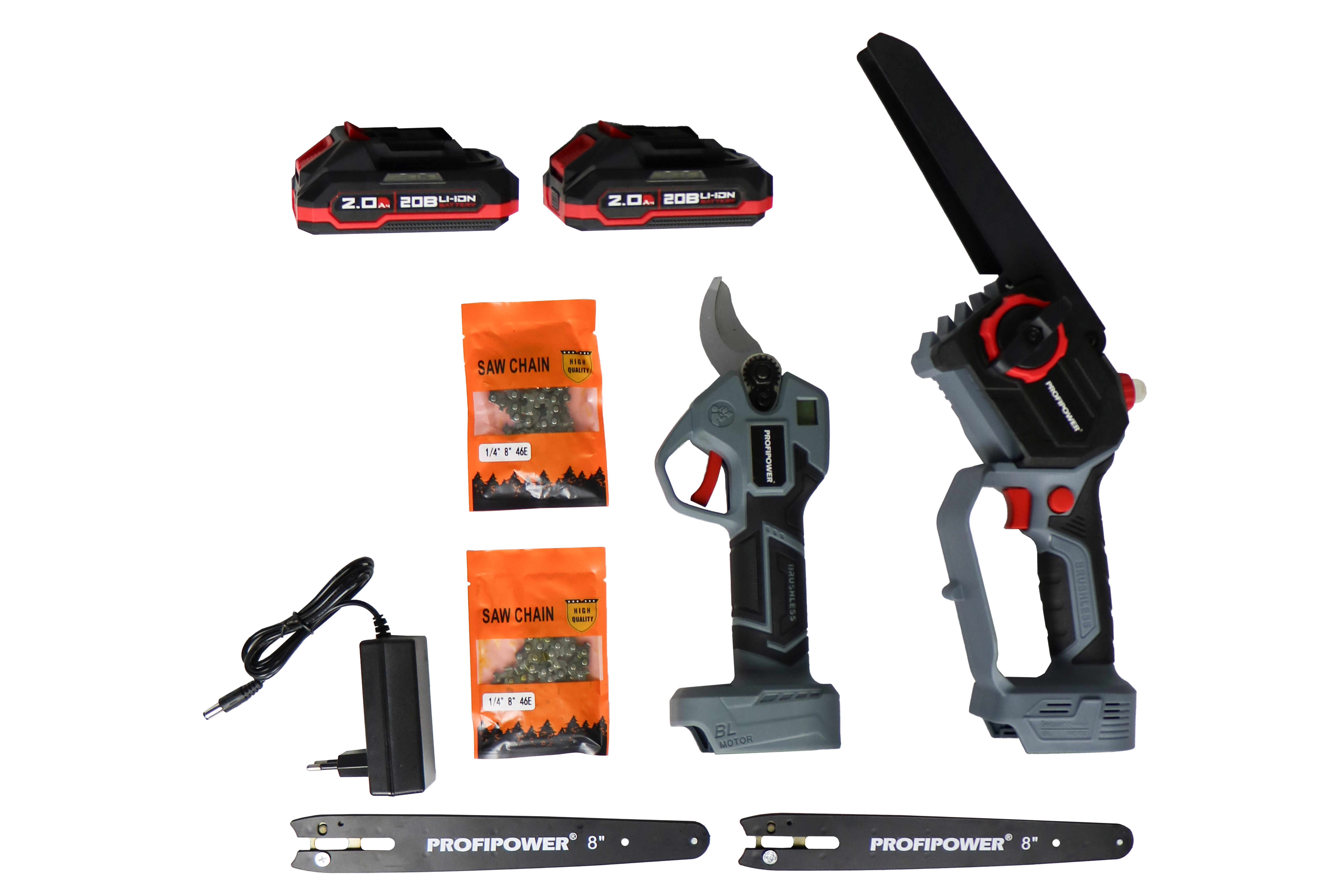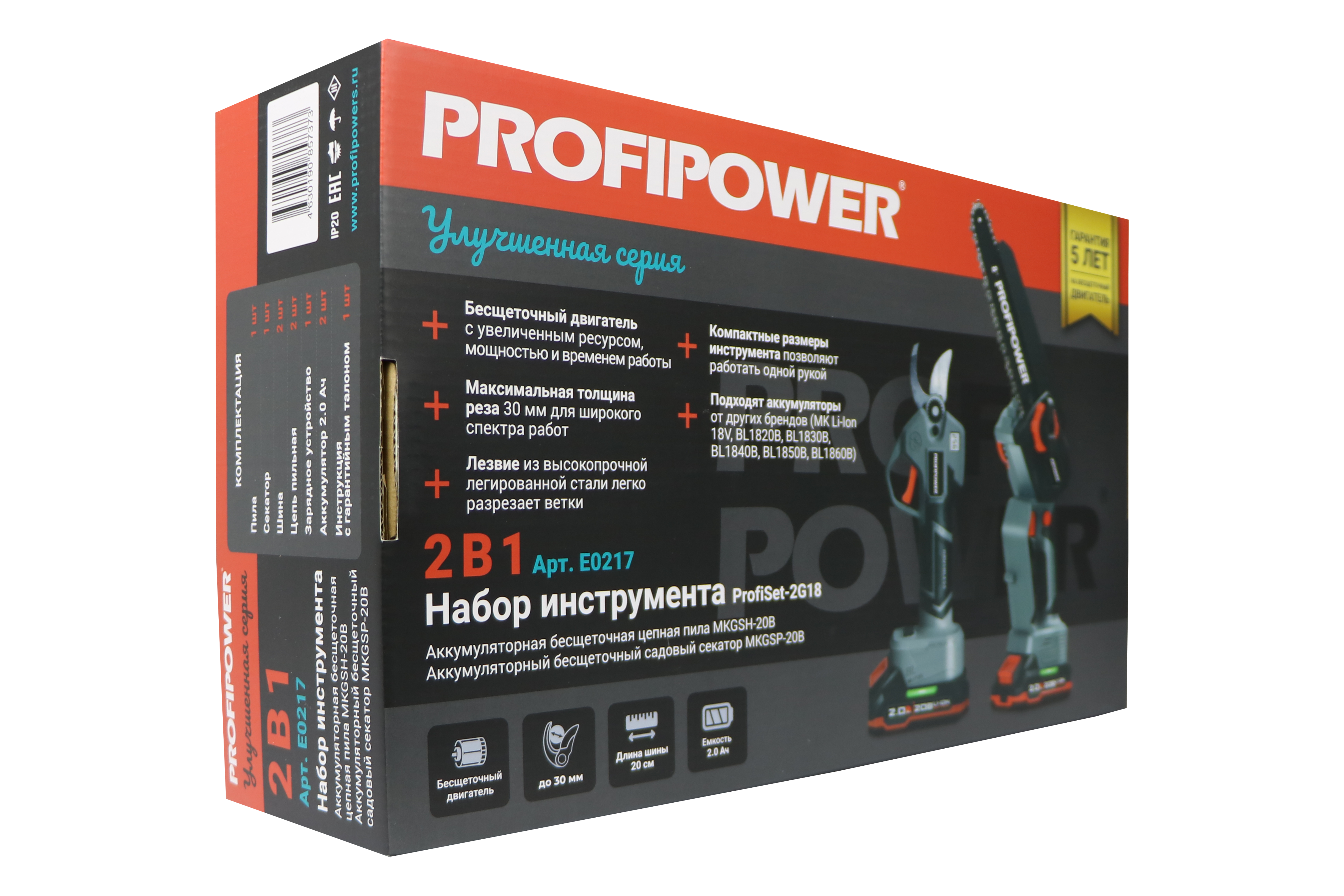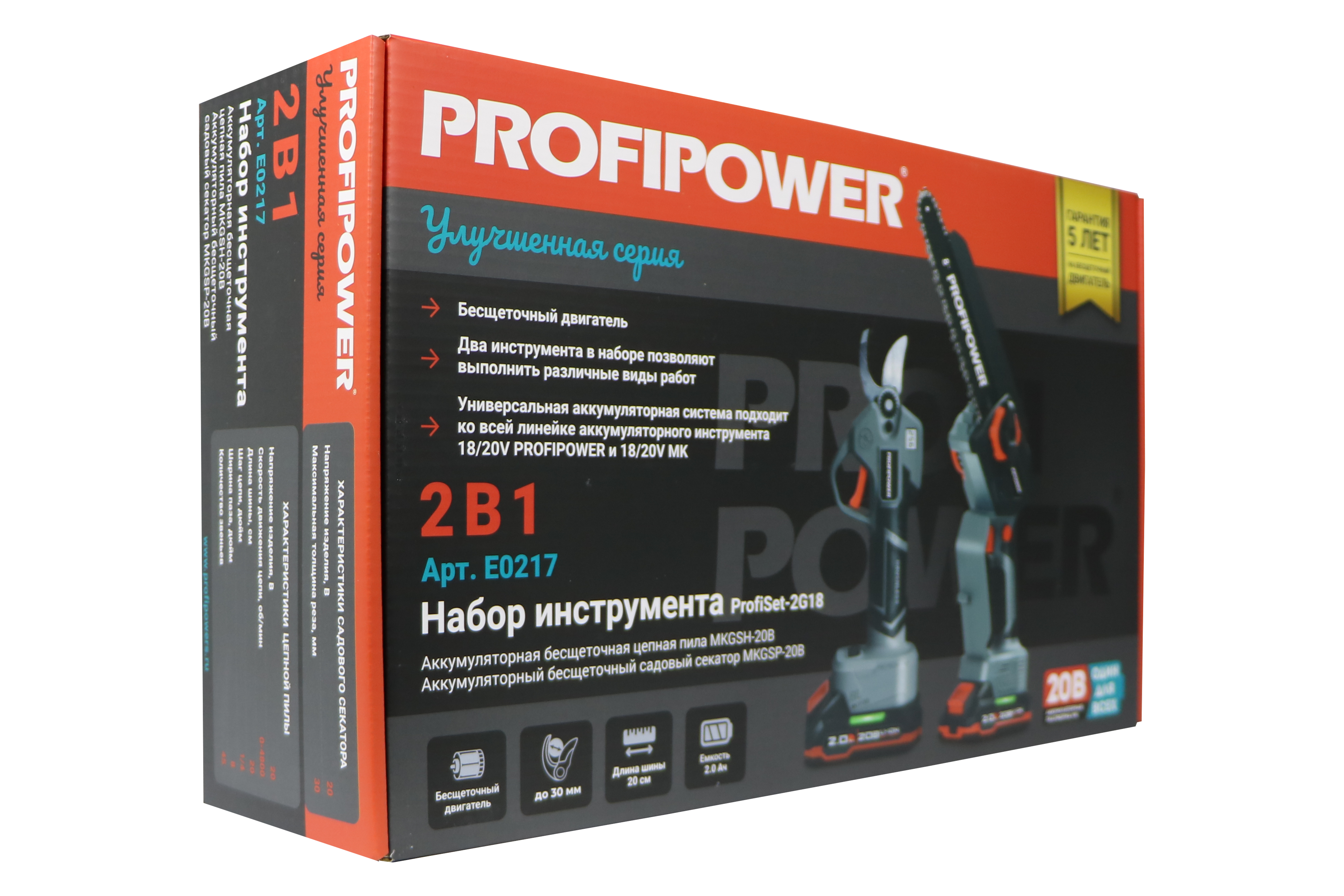 E0217 набор аккумуляторных инструментов PROFIPOWER ProfiSet-2G20 — универсальный 2в1 комплект для садовых и бытовых задач. Включает два литий-ионных аккумулятора 20В, 2.0Ач с зарядным устройством и коробку для удобного хранения и транспортировки. В комплект входят мощная мини-пила с масляной подачей, секатор и два комплекта цепей и шин по 8 дюймов — идеально подходят для обрезки деревьев, кустарников и других работ на участке. Бесщеточный двигатель обеспечивает долговечность и высокую производительность. Надежный, компактный и легкий в использовании набор — ваш незаменимый помощник в саду и дома!