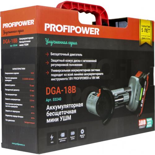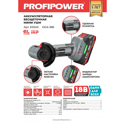 E0240 Аккумуляторная бесщеточная МИНИ УШМ PROFIPOWER DGA-18B – компактная и мощная бесщеточная мини-углошлифовальная машина, созданная для тех, кто ценит маневренность, точность и комфорт при работе одной рукой. Этот инструмент – идеальное решение для выполнения множества задач, где требуется деликатность и скорость, но нет нужды в полноразмерных УШМ.