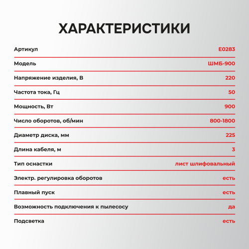 • ШМБ-900 оснащена эффективной системой для сбора пыли. Подключите промышленный пылесос (пожалуйста, уточните, идет ли пылесборник в комплекте или только патрубок для подключения) – и работайте практически без грязи, защищая свои легкие и поддерживая чистоту на объекте.