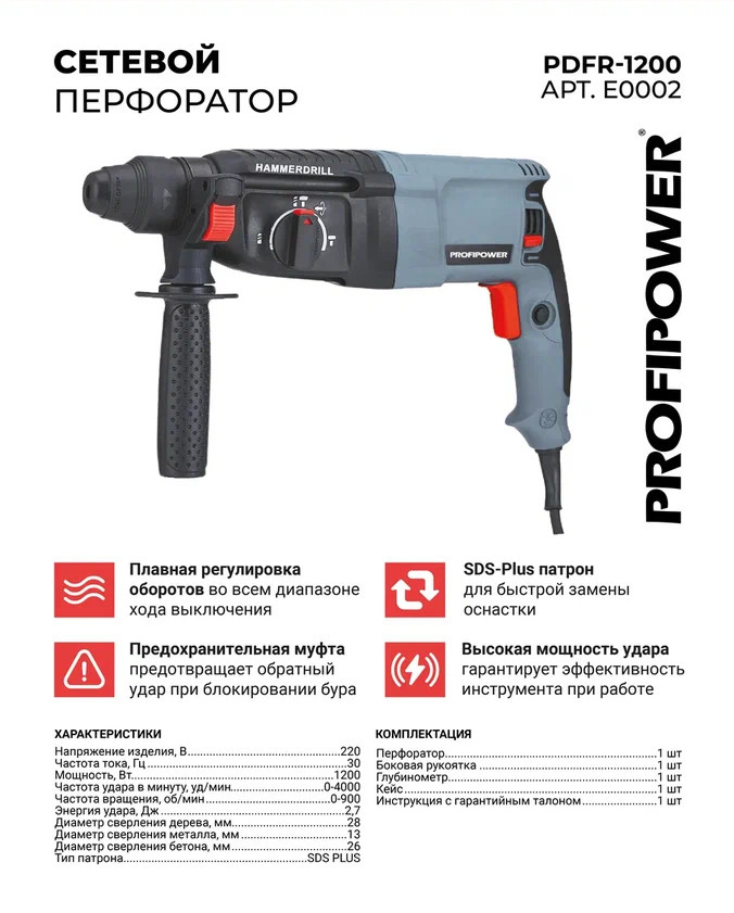 Представляем PROFIPOWER PDFR-1200 – классический сетевой перфоратор легендарного класса 2-26, созданный для интенсивной работы и максимальной эффективности.