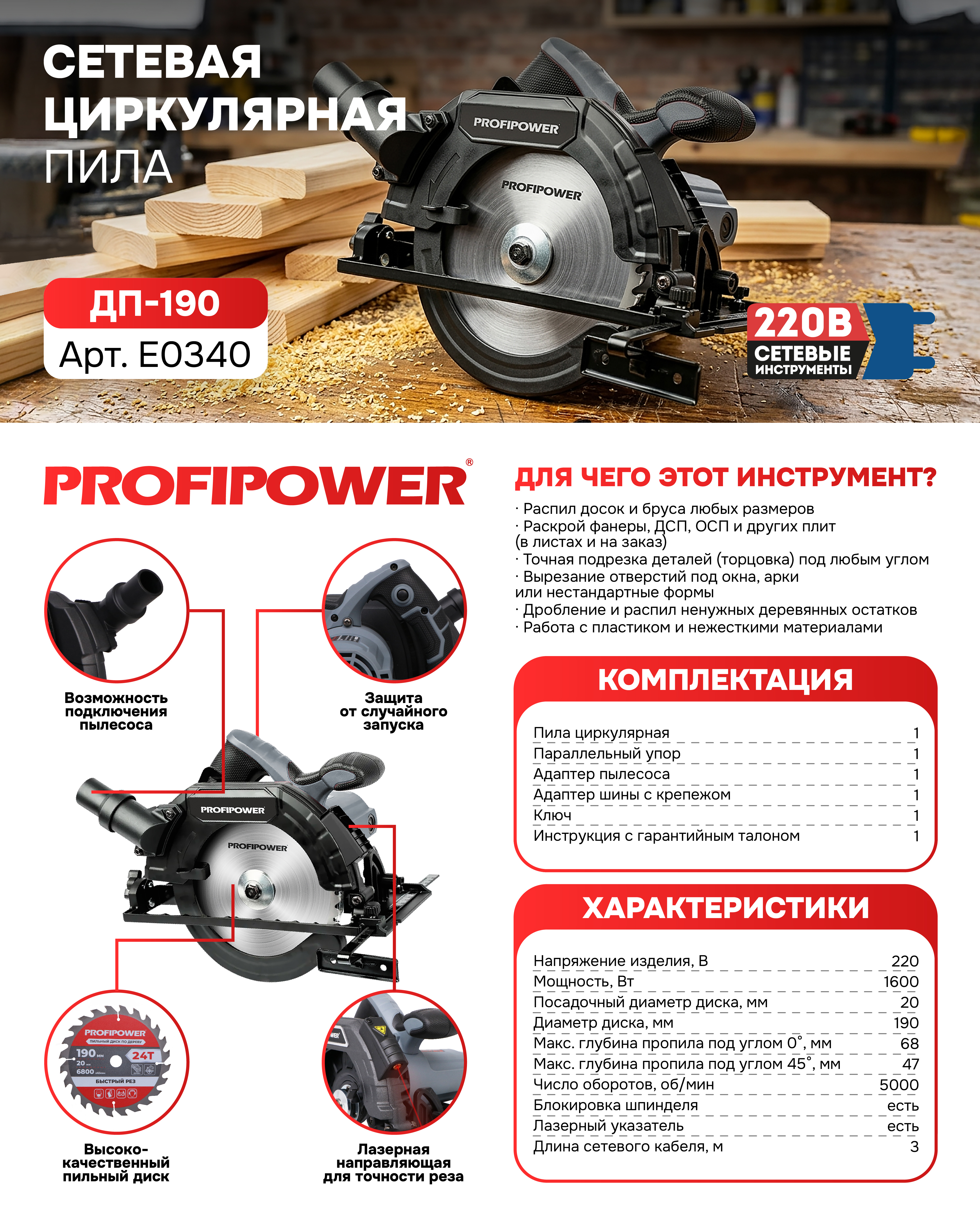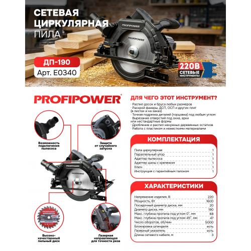 E0340 Пила циркулярная PROFIPOWER LASER ДП-190 — это мощный и точный инструмент, созданный для профессионального раскроя древесины, ДСП, фанеры и других пиломатериалов. Главная особенность модели — встроенный лазерный указатель, который позволяет выполнять идеально ровные резы без предварительной разметки карандашом, что значительно ускоряет работу и повышает её качество.