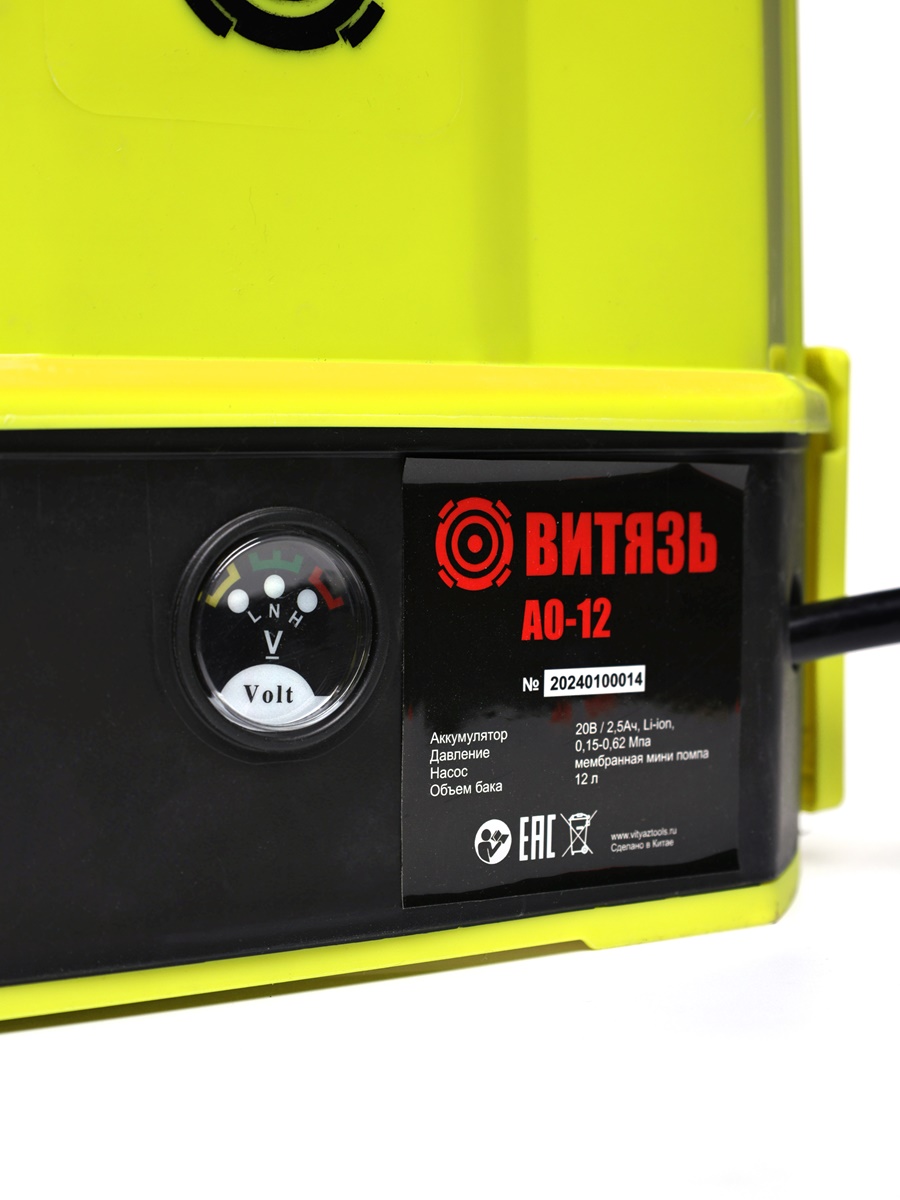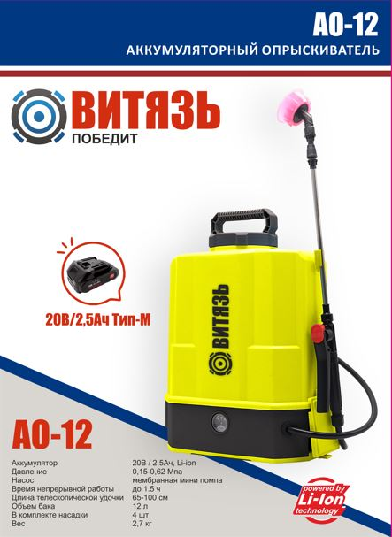 Аккумуляторный опрыскиватель Витязь АО-12 (желтый) - это удобное решение для тех, кто ищет надежную модель с максимальной мобильностью. Благодаря аккумуляторному типу питания вы можете забыть о необходимости подключения к электросети. Способ переноса ранцевый обеспечивает комфорт при работе на больших площадях, а рабочее давление 0,15-062 мп поможет достичь нужного результата за короткое время. Телескопическая штанга позволяет легко регулировать высоту распыления в зависимости от задачи, а объем бака в 12 л гарантирует продолжительную работу без необходимости частой дозаправки. Никаких лишних слов – только функциональные характеристики, которые делают этот опрыскиватель незаменимым инструментом для профессиональной работы на приусадебном участке или в садоводстве. Описание и характеристики Витязь АО-12 (желтый ) тип акамулятора М аналог Makita, Wortex favourite Бренд Витязь Способ переноса ранцевый Рабочее давление 5 бар Телескопическая штанга есть в комплекте 4 насадки длина телескопической трубки 65-100см. Время непрырывной работы до 1,5 часа ,насос мембранного типа мини помпа. Акумулятор 20В /2,5 АЧ LI-on Вес 2,7 кг